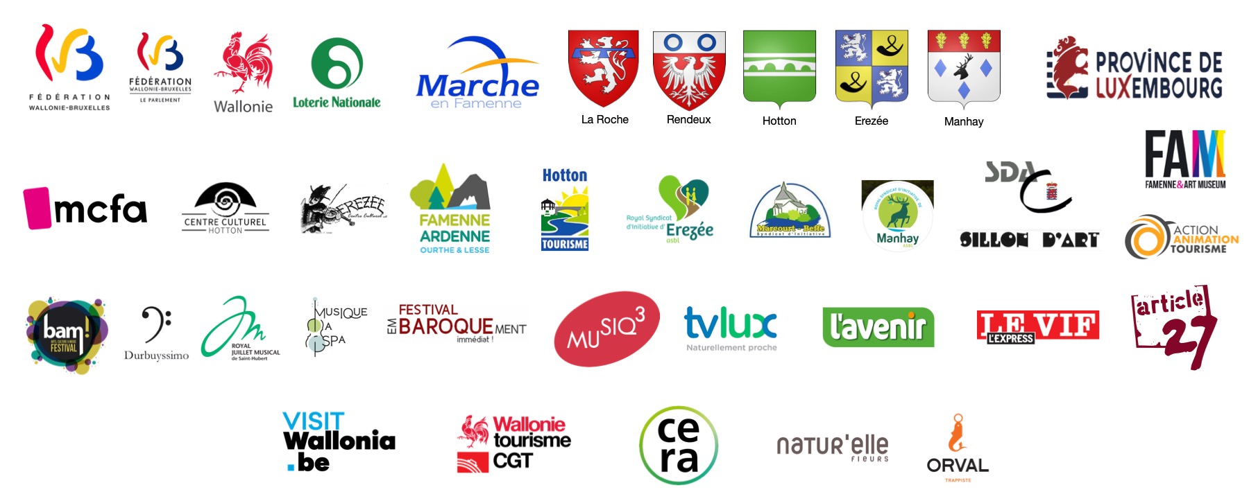 Fédération Wallonie-Bruxelles: Service de la Musique et Enseignement supérieur, Parlement de la Fédération Wallonie-Bruxelles. Loterie Nationale. Région wallonne: Visit Wallonia; Wallonie Tourisme CGT. Province de Luxembourg. Service de diffusion et d'animation culturelle.